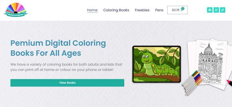 Colouring book website with online store, newsletter subscription form and fun, colourful design.